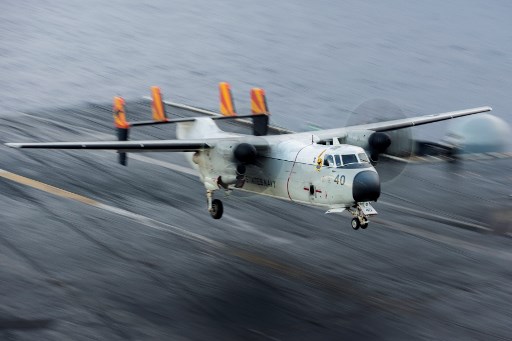 The C-2A is a re-supply workhorse for US aircraft carriers, routinely ferrying cargo, mail and people onto and off the globally deployed vessels.