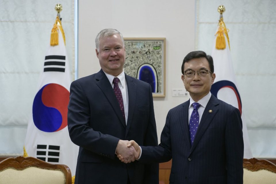 US special representative for North Korea Stephen Biegun (L) shakes hands with with South Korea’s vice foreign minister Cho Sei-young (R) at the foreign ministry in Seoul on December 16, 2019. – The top US representative in talks with North Korea slammed Pyongyang’s demands as hostile and unnecessary as its end-of-year deadline approaches, but held open the door for fresh negotiations. (Photo by Ed JONES / POOL / AFP)