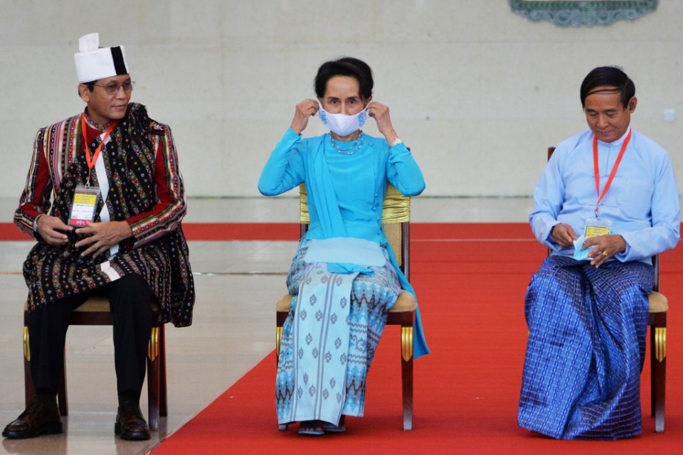 Myanmar’s President Win Myint (R), State Counsellor Aung San Suu Kyi (C) and Vice President Henry Van Thio (L) wear face masks after their photo session during the opening ceremony of the 4th Union Peace Conference (21st Century Panglong) at the Myanmar International Convention Center (2) in Naypyidaw on August 19, 2020. (Photo by Thet Aung / AFP)