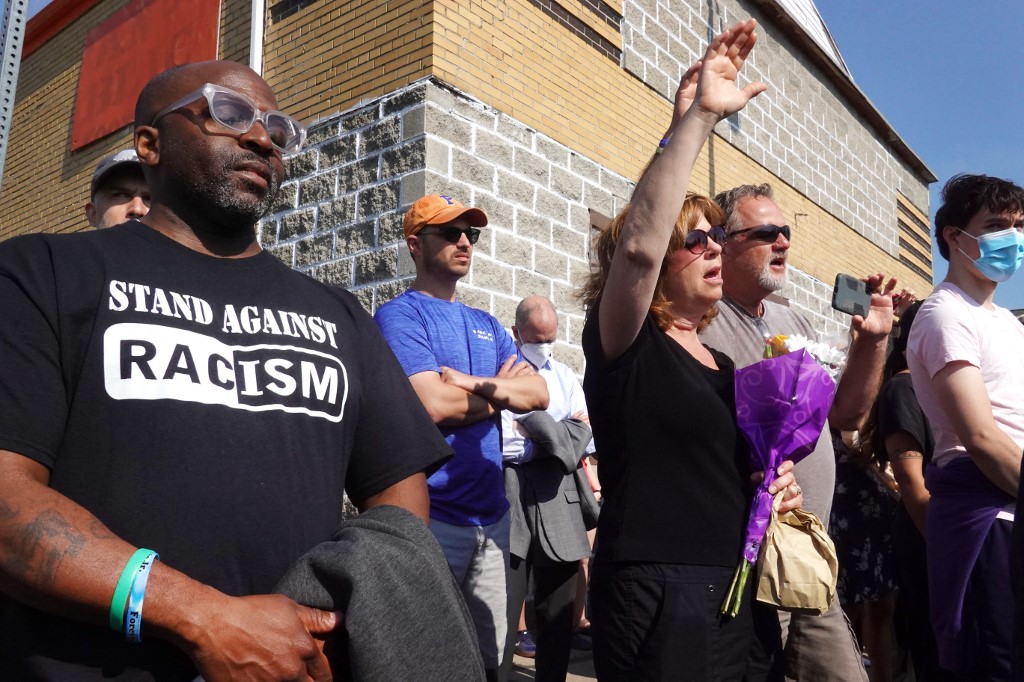 In angry and mournful tones, speakers decried easy access to powerful guns and the latest eruption of racist violence, in what has become tragically routine brutality in the United States.