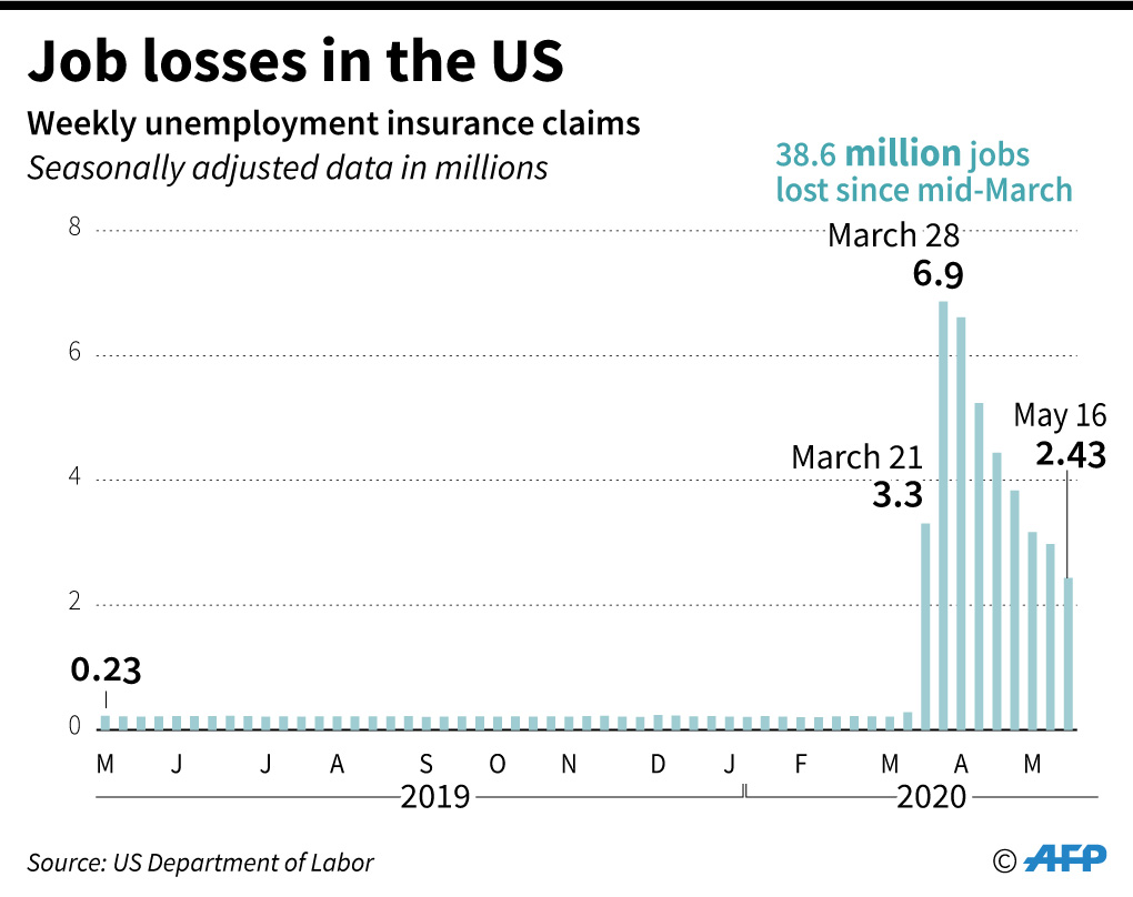 WASHINGTON, United States (AFP) — Job losses in the United States are slowing but totaled an unheard-of 38.6 million since the coronavirus pandemic lockdowns began, while officials debate what additional steps will be needed to rescue the beleaguered economy.
