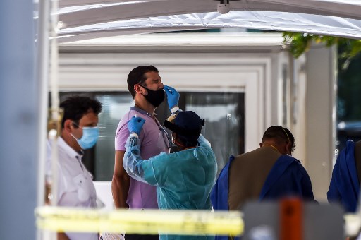 (FILES) In this file photo taken on June 24, 2020 a medical personnel member takes samples on a man at a “walk-in” and “drive-through” coronavirus testing site in Miami Beach, Florida. – The United States passed nine million reported coronavirus cases on October 30, 2020, according to a tally from Johns Hopkins University, as infections spike days before the nation chooses its next president.
