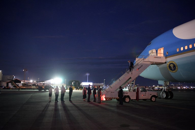 Trump arrived in the Philippine capital for regional summits, the last leg of a marathon Asian tour, according to an AFP reporter travelling with him. / AFP PHOTO / JIM WATSON