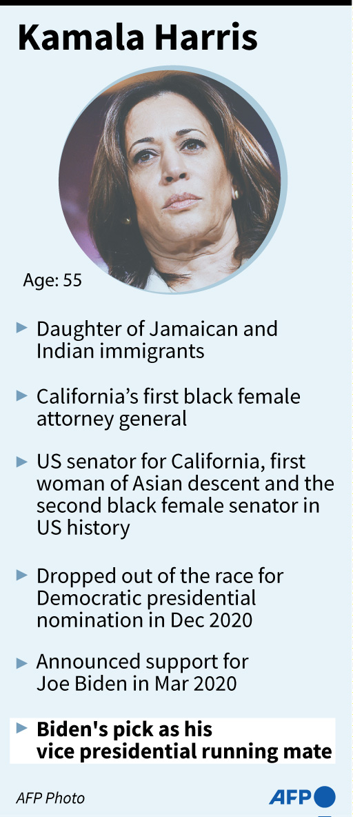 WASHINGTON, United States (AFP) — US Presidential hopeful Joe Biden named Senator Kamala Harris, a former rival in the White House race, as his running mate Tuesday, marking a historic first for American women of color.