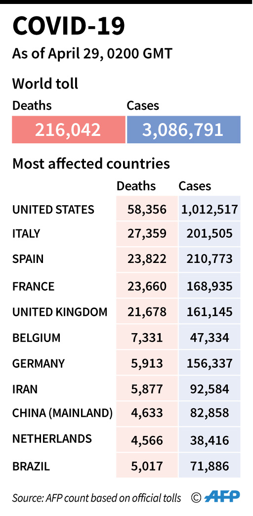 The new coronavirus has killed at least 214,451 people since the outbreak first emerged in China in December, according to a tally compiled by AFP at 1900 GMT on Tuesday.