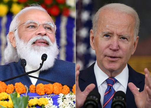 and a file photo taken on April 2, 2021, of US President Joe Biden(R) speaking in the State Dining Room of the White House in Washington, DC. – US President Joe Biden promised emergency assistance to Covid-ravaged India in a telephone call on April 26, 2021 with Prime Minister Narendra Modi, the two countries said. Biden “pledged America’s steadfast support for the people of India” and said the United States “is providing a range of emergency assistance, including oxygen-related supplies, vaccine materials and therapeutics,” the White House said. (Photos by – and MANDEL NGAN / various sources / AFP)