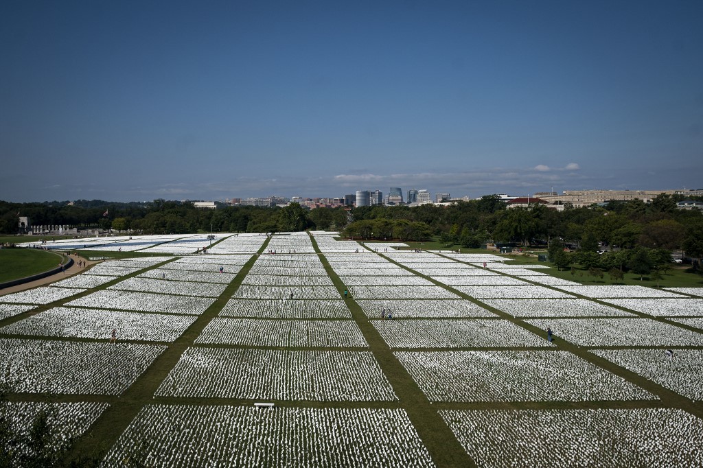 In Washington, hundreds of thousands of white flags fluttered on the grass on the National Mall, not far from the White House, as somber reminders of those who have died of Covid in the United States.