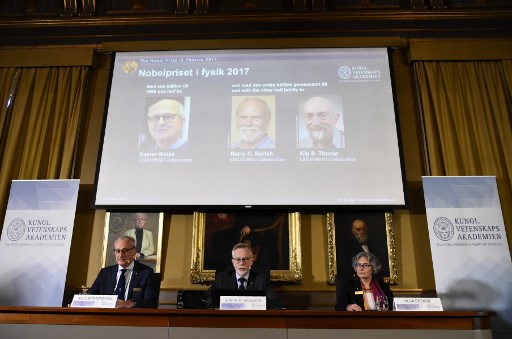 STOCKHOLM, Sweden (AFP) — US astrophysicists Barry Barish, Kip Thorne and Rainer Weiss were awarded the Nobel Physics Prize on Tuesday for the discovery of gravitational waves, the Nobel jury said.