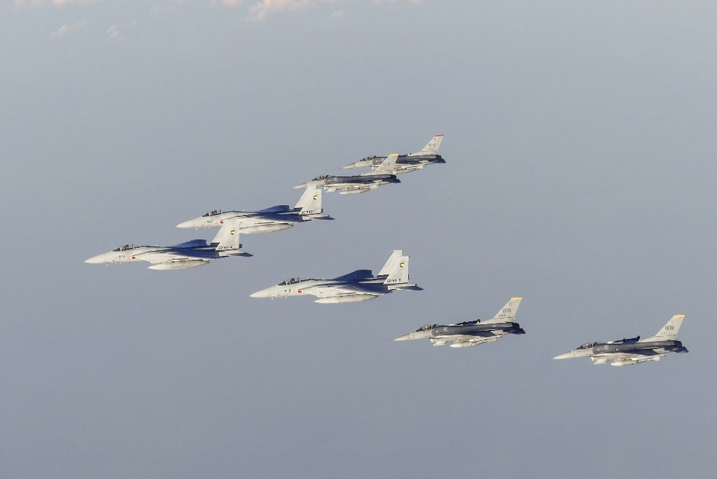 (FILES) This handout photo taken and released by Japan’s Ministry of Defense on November 18, 2022 shows members of Japan’s Self-Defense Forces and US Armed Forces conducting a bilateral exercise over the Sea of Japan, also known as the East Sea. (Photo by Handout / Japan’s Ministry of Defense / AFP)