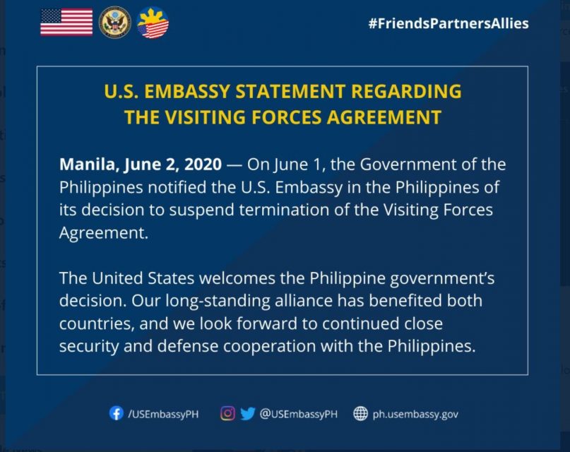 On June 1, the Government of the Philippines notified the U.S. Embassy in the Philippines of its decision to suspend termination of the Visiting Forces Agreement. https://t.co/uoG85DIRMQ pic.twitter.com/lHAXflagK0