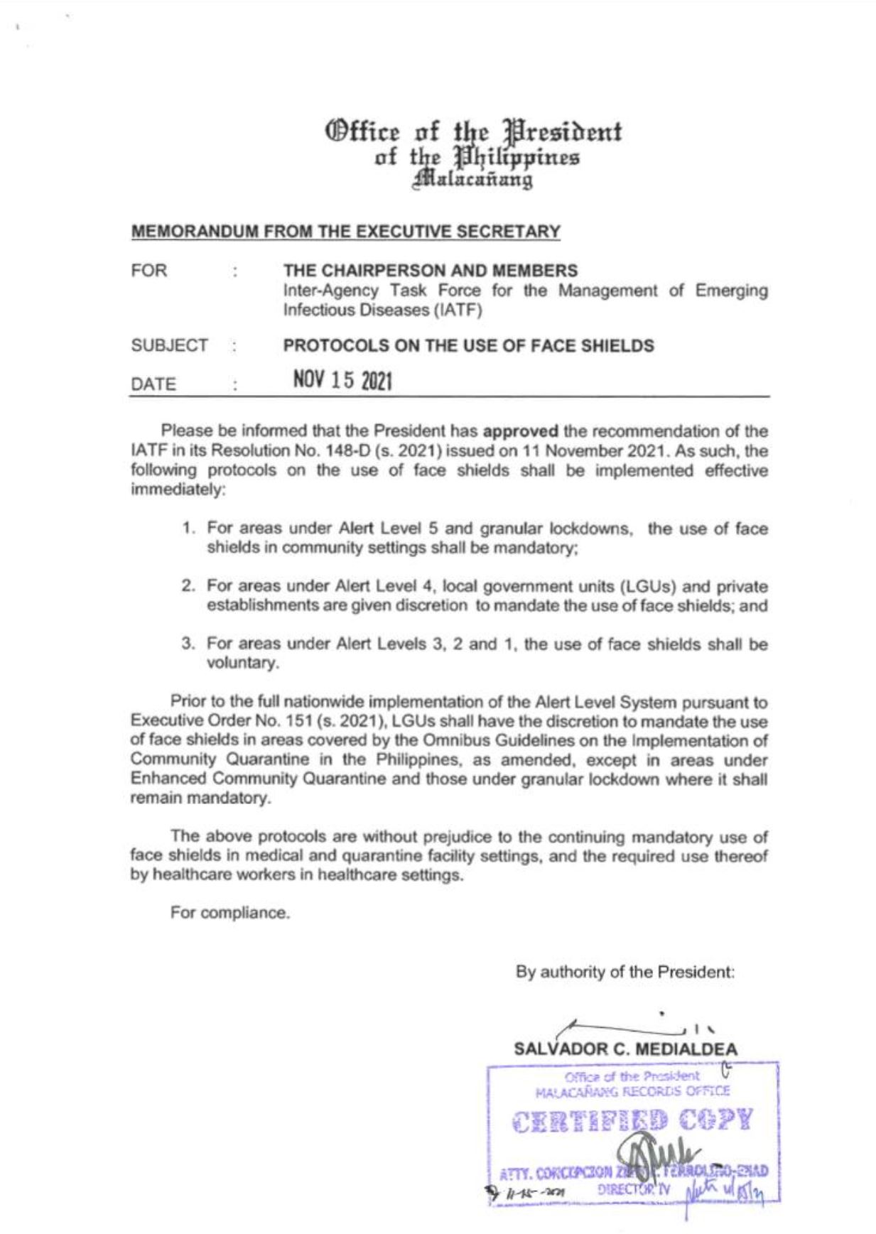 (Eagle News) – The use of face shields in areas under COvid-19 alert levels 3, 2 and 1 “shall be voluntary,” according to a Nov. 15, 2021 memorandum from the Office of the President.