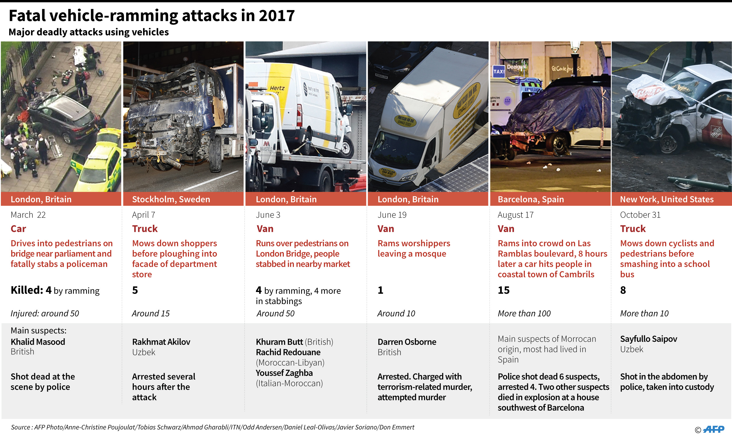 Vehicles have previously been used as weapons of terror, often by supporters of the Islamic State (IS) group, attacking nations in the US-led coalition fighting the jihadists in Iraq and Syria.