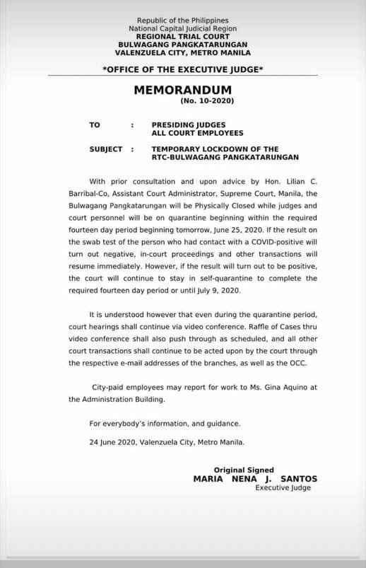 “If the result of the swab test of the person who had contact with a COVID-positive will turn out negative, in-court proceedings and other transactions will resume immediately,” the memo said.