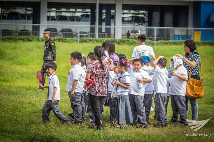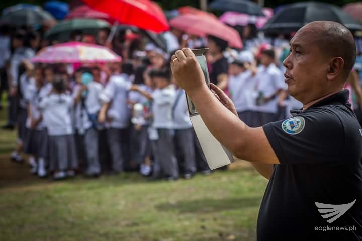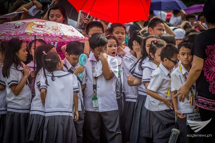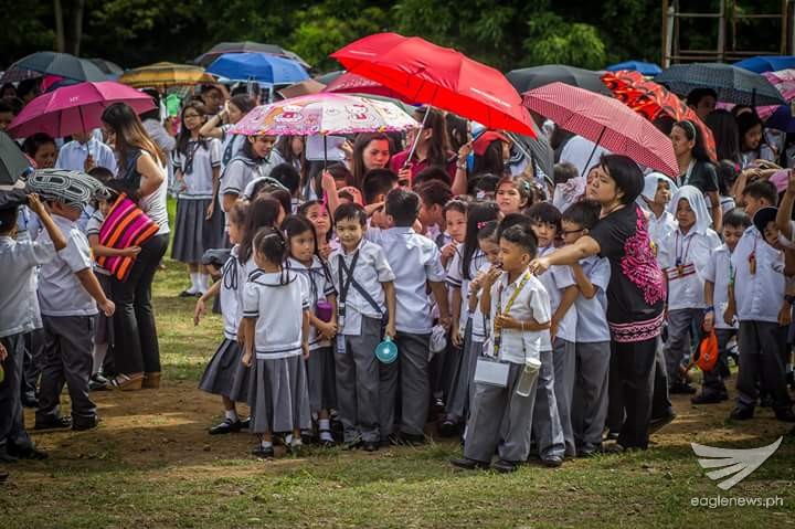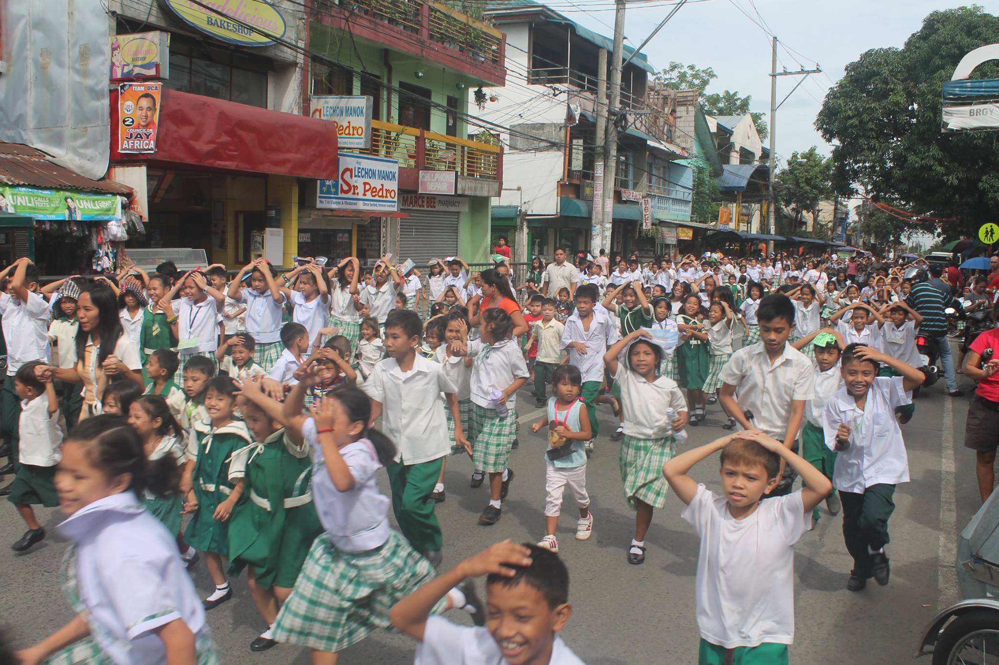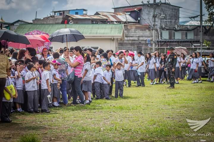 Students in Silay North Elementary School, Negros Occidental gathered outside the school premises after hearing the siren that signals the start of the earthquake drill.