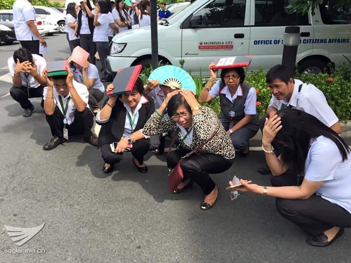 Employees and students in the Valenzuela City Math and Science High School participated in the Metro Manila Development Authority’s 2nd Metro Shake Drill (Photo courtesy of EBC News Correspondent, Alejandro B. Soriano)