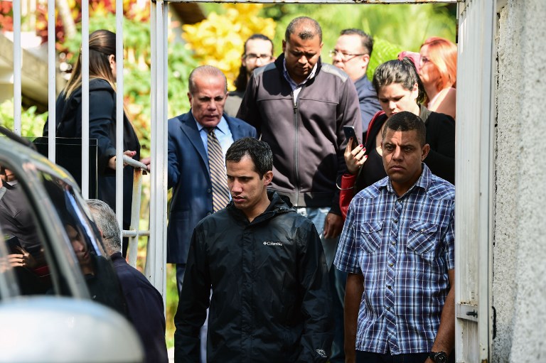 Venezuelan opposition leader and self-proclaimed interim president Juan Guaido (C) leaves the residence of his Chief of Staff Roberto Marrero, who was arrested during a raid early March 21, 2019 at his house in Caracas. – Venezuelan intelligence officers Thursday arrested the chief of staff of Juan Guaido, the opposition leader recognized by the US and other countries as interim leader, Guaido and the opposition-ruled congress said on Twitter. Roberto Marrero was grabbed by SEBIN officers when they staged a pre-dawn raid on his Caracas home, according to Guaido and a recorded voice message by Marrero published on social media. (Photo by RONALDO SCHEMIDT / AFP)