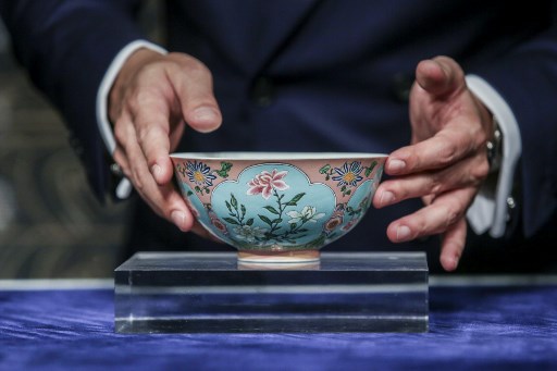 An extremely rare Qing Dynasty bowl made for the Chinese emperor Kangxi fetched 30.4 million USD, Sotheby’s said. / AFP PHOTO