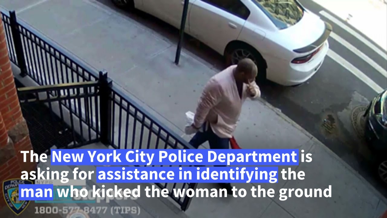 In the video, posted online by police, the man can be seen walking up to the 65-year-old woman and kicking her in the stomach, knocking her to the ground.
