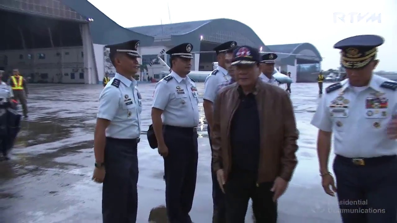 In this video released by Malacanang, President Duterte is shown saluting soldiers as he visited Villamor Air Base in Taguig City after alighting from a helicopter. He was accompanied by his trusted aide, Special Assistant to the President Christopher “Bong” Go.