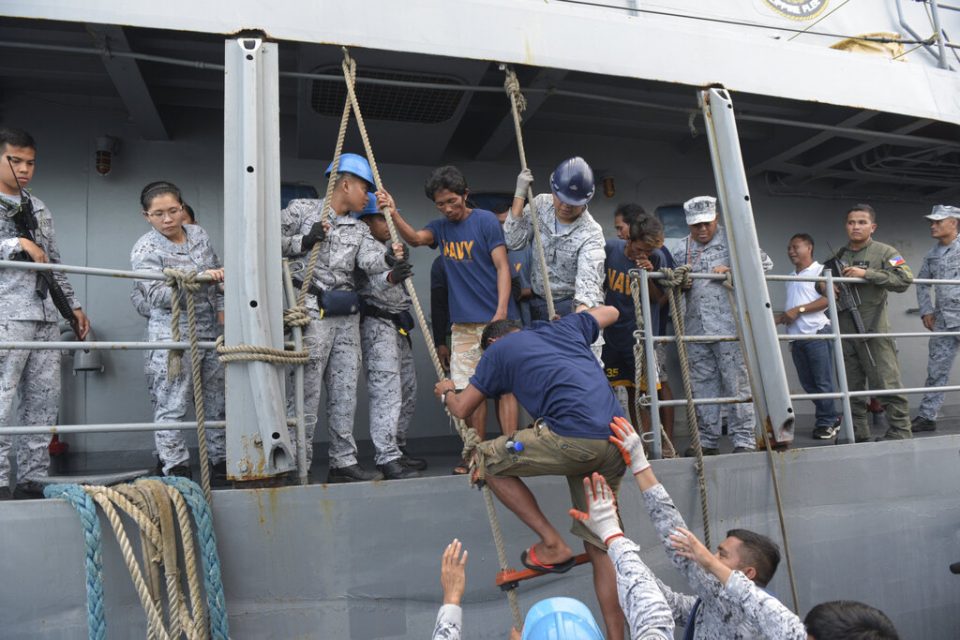 Rescued Filipino fishermen transfer to another ship as they head back to shore in Occidental Mindoro province, Philippines on Friday June 14, 2019. The Philippines’ top diplomat said he has filed a diplomatic protest after an anchored fishing boat was hit by a suspected Chinese vessel which then abandoned the 22 Filipino fishermen as the boat sank in the disputed South China Sea. (AP Photo)
