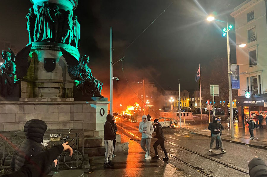 Near O’Connell Bridge, over the River Liffey, flames rose from a torched car and bus, while crowds broke into stores and looted goods on one of the city’s main shopping streets.