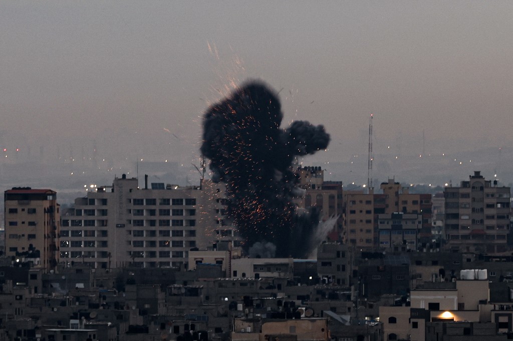 Smoke rises above buildings in Gaza City as Israel launched air strikes on the Palestinian enclave early on February 23, 2023. (Photo by MOHAMMED ABED / AFP)