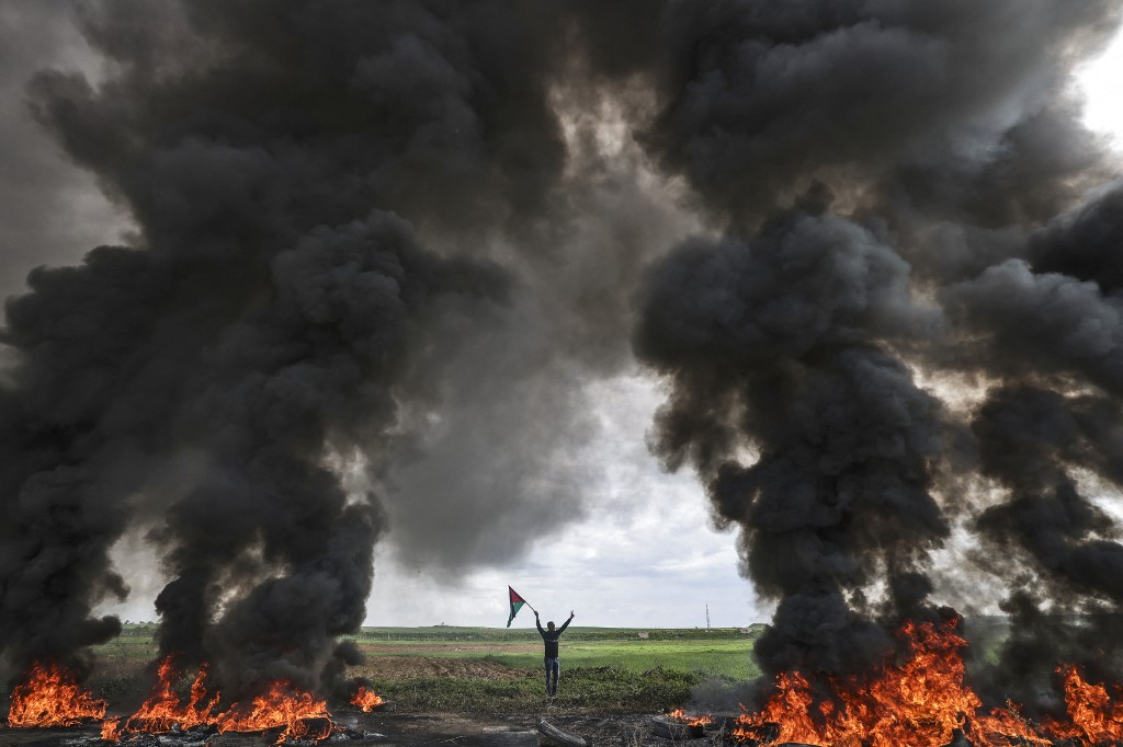 Palestinian youths burn tires during a protest near the Israel-Gaza border east of Jabalia refugee camp, on February 23, 2023. (Photo by MAHMUD HAMS / AFP)