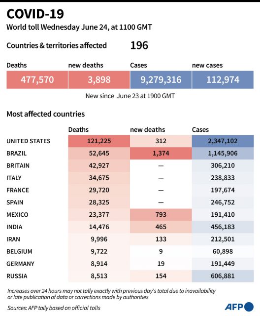 The number of deaths worldwide from the outbreak has surged past 477,000, a doubling of the toll in less than two months, according to an AFP tally on Wednesday.