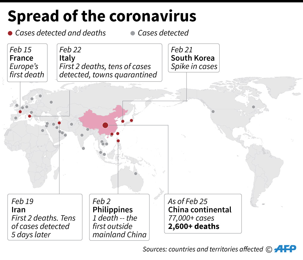The virus has killed more than 2,600 people and infected over 77,000 others in China. In the rest of the world, there have been more than 40 deaths and 2,700 cases.