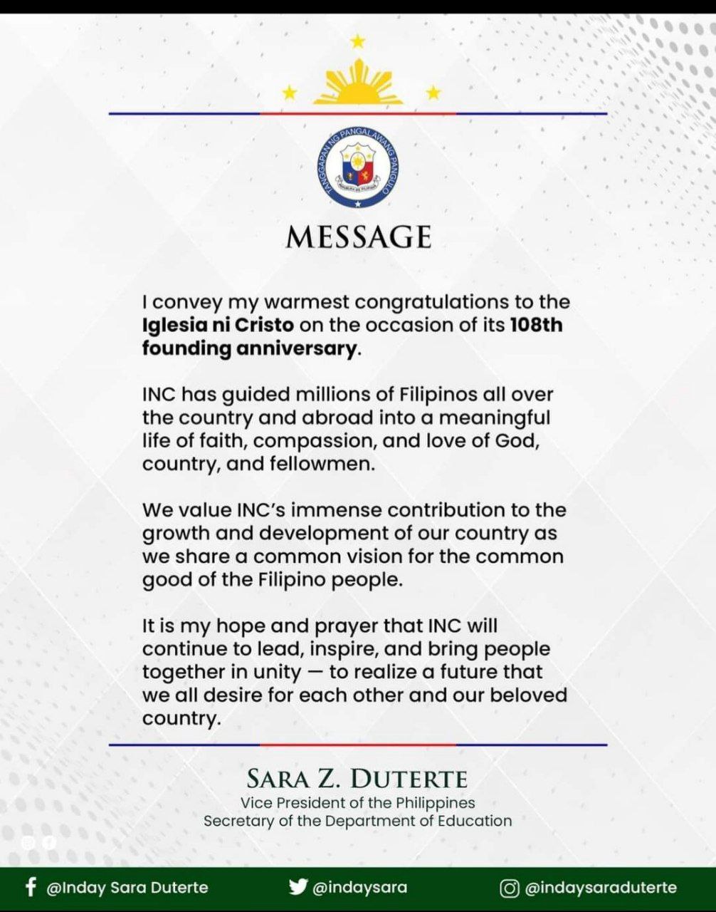 (Eagle News) – Vice-President Sara Duterte conveyed her warmest congratulations to the Iglesia Ni Cristo (INC) on the occasion of its 108th anniversary on Wednesday, July 27.