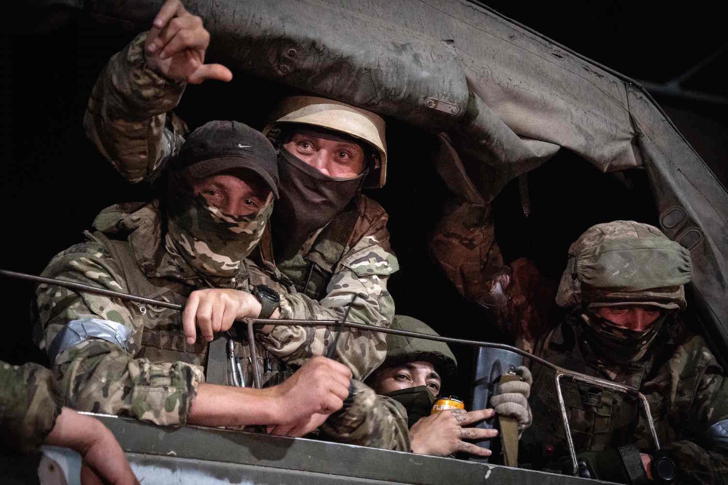 Members of Wagner group looks from a military vehicle in Rostov-on-Don late on June 24, 2023. Rebel mercenary leader Yevgeny Prigozhin who sent his fighters to topple the military leaders in Moscow will leave for Belarus and a criminal case against him will be dropped as part of a deal to avoid “bloodshed,” the Kremlin said on June 24. (Photo by Roman ROMOKHOV / AFP)