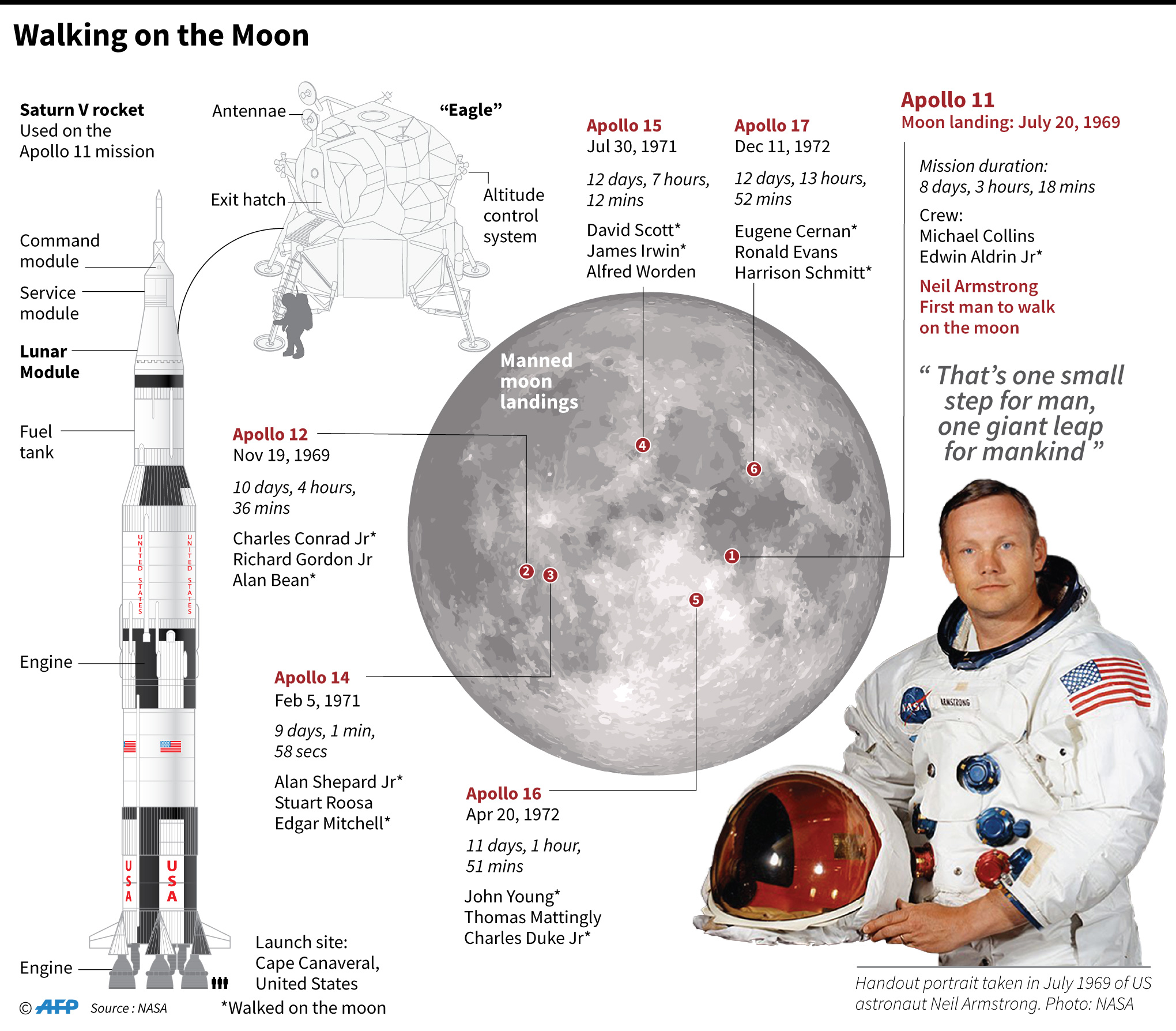 Graphic on crewed missions to the moon, ahead of the 50th anniversary of the first human steps on the moon by Neil Armstrong on July 20, 1969