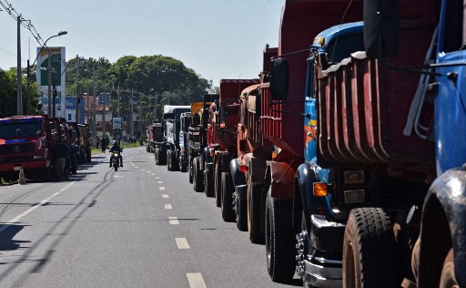 Trucks block a highway during a protest of truck drivers against the price of gas and a possible new rise of it, in Asuncion, on March 14, 2022. (Photo by NORBERTO DUARTE / AFP)