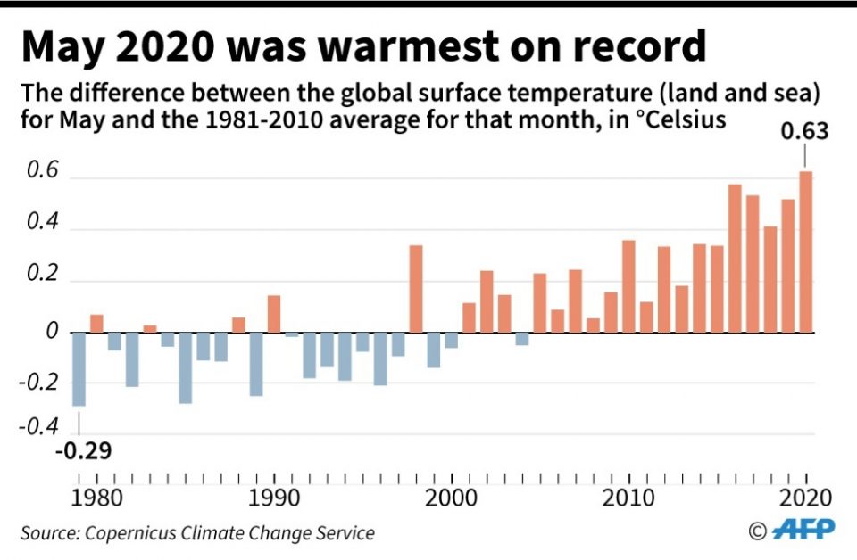Globally, the average temperature for the twelve months to May 2020 is close to 1.3C above preindustrial levels, the benchmark by which global warming is often measured.