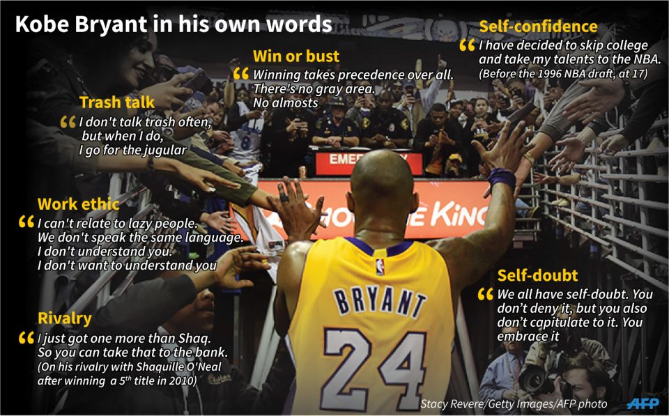 LOS ANGELES, United States (AFP) — Kobe Bryant combined rare shooting skills, a tireless work ethic, fierce competitiveness, mental toughness and creativity to become one of the NBA’s greatest players, according to his fellow basketball legends.