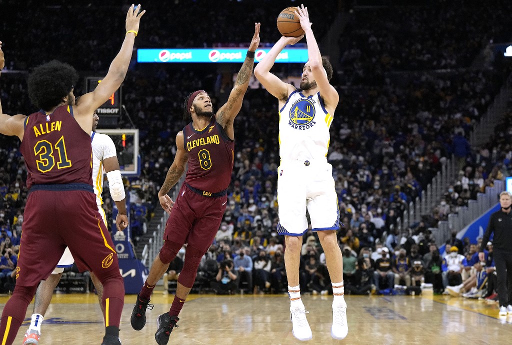 Thompson scored the Warriors’ first basket of the game on their first possession, dispelling any doubt that he was back with a thundering dunk with 2:56 remaining in the first half, driving past Cleveland center Jarrett Allen and ramming the ball home over two Cavs defenders.