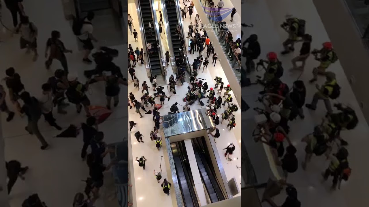 In this video taken by the Eagle News team headed by EBC correspondent Kit Wong in Hong Kong, clashes between riot police and protesters turned violent inside the New Town Plaza Mall in Sha Tin late Sunday evening, July 14, 2019.
