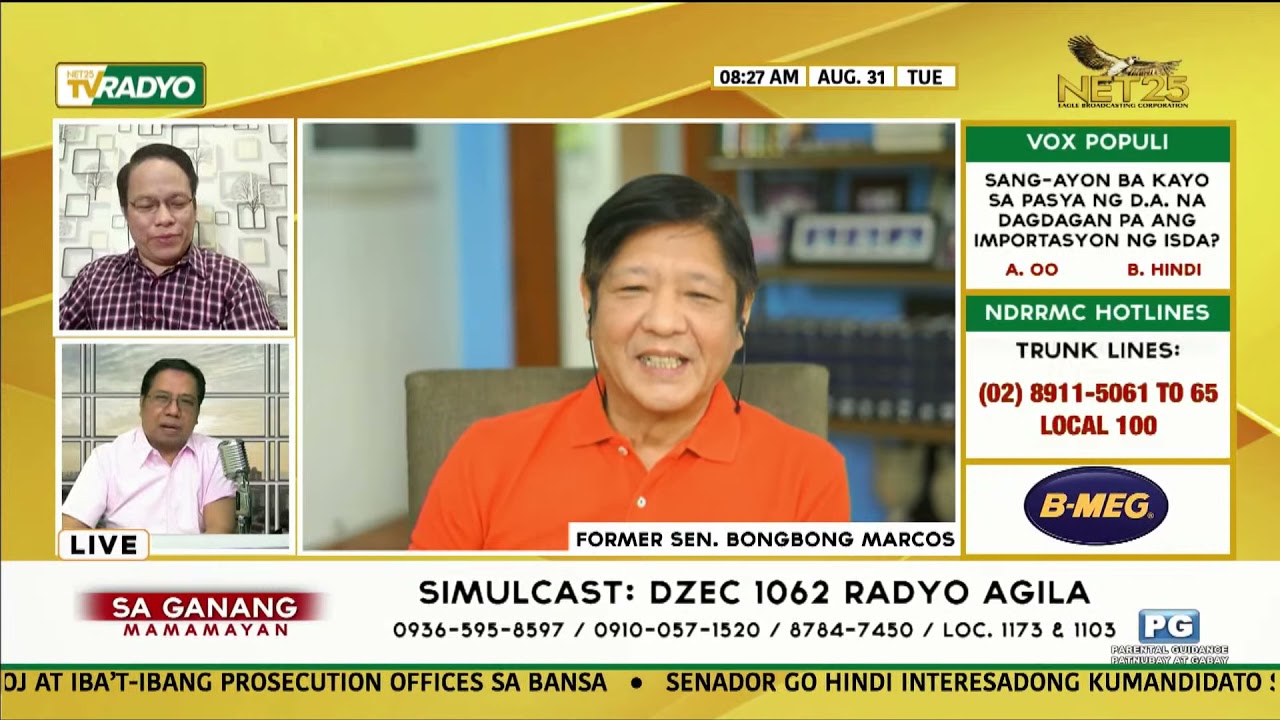 Eagle Broadcasting Corporation’s NET25-Radyo Agila program “Sa Ganang Mamamayan” interviews former Senator and vice-presidential candidate Ferdinand “Bongbong” Marcos Jr., on Tuesday, Aug. 31, 2021. He discusses many issues including his plans for the 2022 elections.