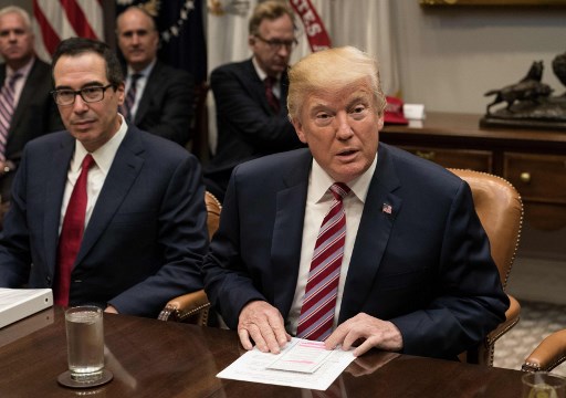 To his right is Treasury Secretary Steve Mnuchin. / AFP /