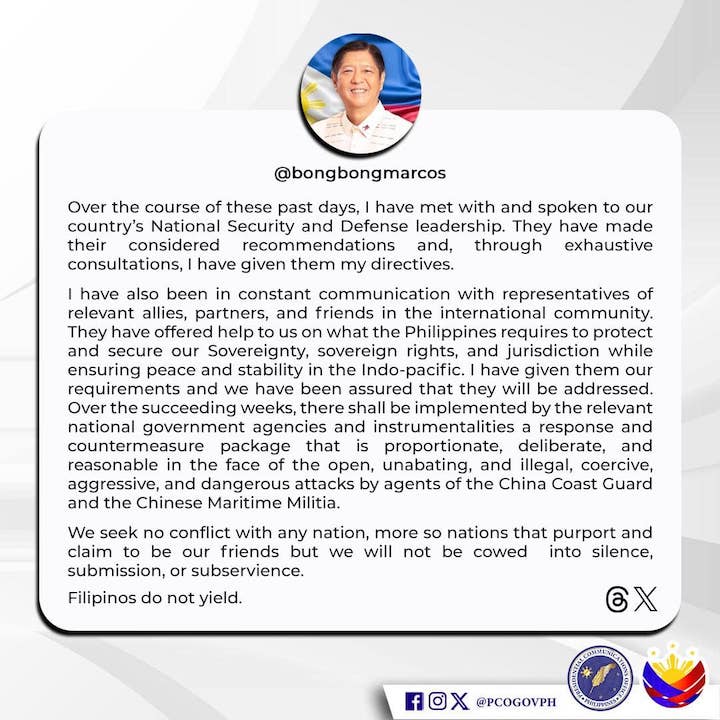 “We seek no conflict with any nation, more so nations that purport and claim to be our friends but we will not be cowed into silence, submission, or subservience,” Marcos said in a statement.