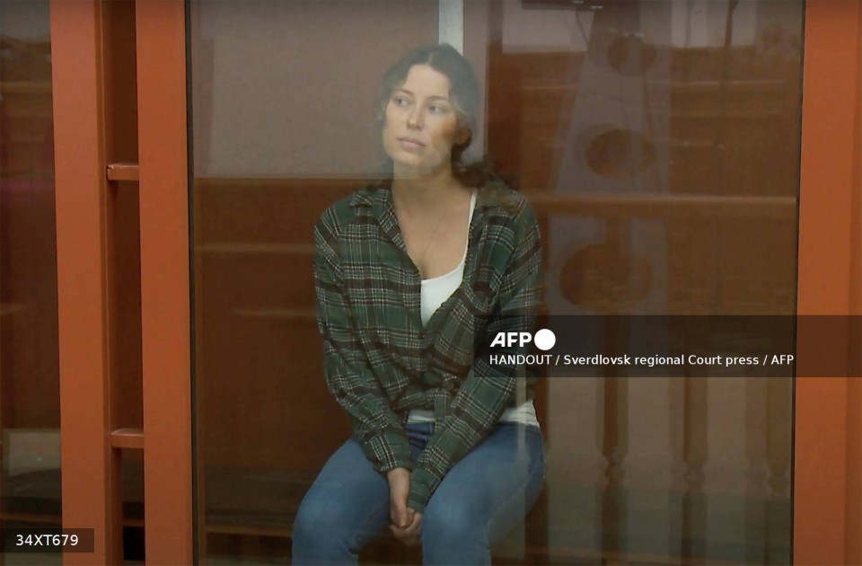 This grab from a handout footage taken and released by Sverdlovsk regional Court press service on June 20, 2024 shows US-Russian citizen Ksenia Karelina siting in a cage at the Sverdlovsk regional Court in Yekaterinburg. – A dual US-Russian citizen accused of donating around $50 to a pro-Ukrainian charity goes on trial for treason in the Russian city of Yekaterinburg. Ksenia Karelina, a 32-year-old ballerina living and working in Los Angeles, was detained by police in Yekaterinburg in late January while on a trip to visit her family in Russia. Prosecutors accuse her of “proactively transferring funds to a Ukrainian organisation, which the Ukrainian Armed Forces subsequently used to purchase tactical medicine, equipment, weapons and ammunition.” She faces life in prison if found guilty. (Photo by HANDOUT / Sverdlovsk regional Court press / AFP) / RESTRICTED TO EDITORIAL USE – MANDATORY CREDIT “AFP PHOTO / SVERDLOVSK DISTRICT COURT ” – NO MARKETING NO ADVERTISING CAMPAIGNS – DISTRIBUTED AS A SERVICE TO CLIENTS
