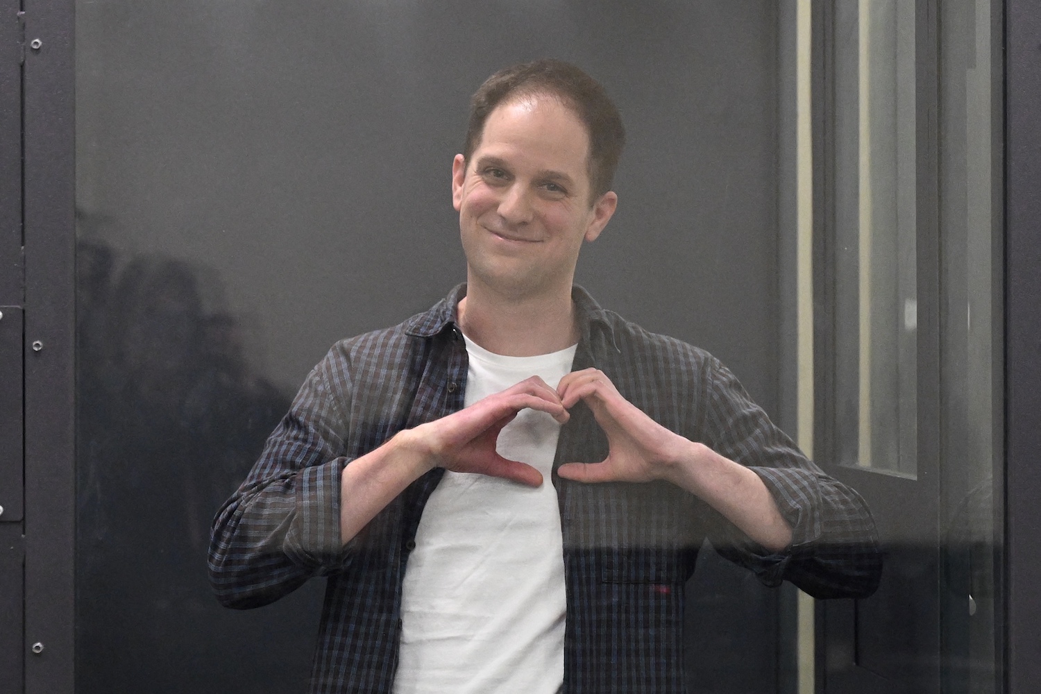 (FILES) US journalist Evan Gershkovich, arrested on espionage charges, shapes a heart with his hands inside a defendants’ cage after a hearing to consider an appeal on his extended pre-trial detention, at the The first court of appeal in Moscow on April 23, 2024. – Evan Gershkovich, a US reporter for Wall Street Journal, will go on trial in Russia on June 26, 2024 on espionage charges with the hearings held behind closed doors. Russian prosecutors have accused him of working for the CIA and “collecting secret information” about tank maker Uralvagonzavod in the Sverdlovsk region in the Urals. The trial will take place in the Sverdlovsk region’s main city of Yekaterinburg, where Gershkovich was arrested 15 months ago while on a reporting trip. He faces 20 years in a prison colony if convicted of espionage charges. (Photo by Natalia KOLESNIKOVA / AFP)
