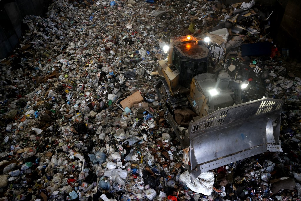 SAN FRANCISCO, CALIFORNIA – APRIL 2: A bulldozer pushes a pile of trash in a pit at Recology on April 2, 2021 in San Francisco, California. Concerns are growing over discarded COVID-19 related used personal protective equipment (PPE) that is littering streets and waterways since it contains microplastics that don’t break down easily and could take hundreds of years to decompose. In September of 2020, the California Coastal Commission created a new category for masks and gloves for its coastal cleanups. Recology is a waste management company that tries to extract more resources from waste. (Photo by JUSTIN SULLIVAN / GETTY IMAGES NORTH AMERICA / Getty Images via AFP)
