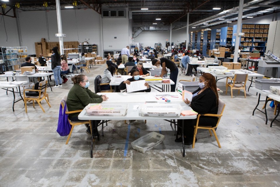 LAWRENCEVILLE, GA – NOVEMBER 06: Gwinnett County election workers look over absentee and provisional ballots at the Gwinnett Voter Registrations and Elections office on November 6, 2020 in Lawrenceville, Georgia. The 2020 presidential race between incumbent U.S. President Donald Trump and Democratic nominee Joe Biden is still too close to call with outstanding ballots in a number of states including Georgia. Jessica McGowan/Getty Images/AFP