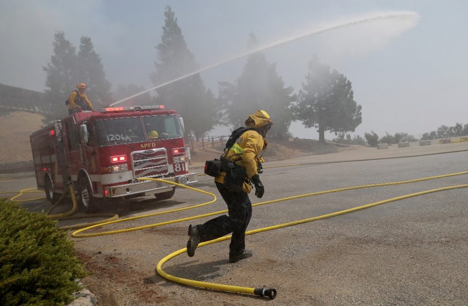 (File photo) PASADENA, CALIFORNIA – SEPTEMBER 16: Firefighters spray water at Mount Wilson Observatory in preparation for the arrival of a firefighting helicopter as the Bobcat Fire burns nearby in the Angeles National Forest on September 16, 2020 near Pasadena, California. The fire came within 500 feet of the historic 116-year-old observatory yesterday. California’s national forests remain closed due to wildfires which have already incinerated a record 3.2 million acres this year. The Bobcat Fire, burning in the San Gabriel Mountains, has grown to over 44,000 acres. Mario Tama/Getty Images/AFP
