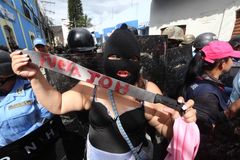 A supporter of the presidential candidate for the Honduran Opposition Alliance Against the Dictatorship in the past election, Salvador Nasralla, holds a knife reading “JOH out”, referring to reelected Honduran President Juan Orlando Hernandez, during a protest outside the Congress building during the installation of the first legislature of the period 2018-2022, at the National Congress in Tegucigalpa on January 25, 2018. / AFP PHOTO / STR
