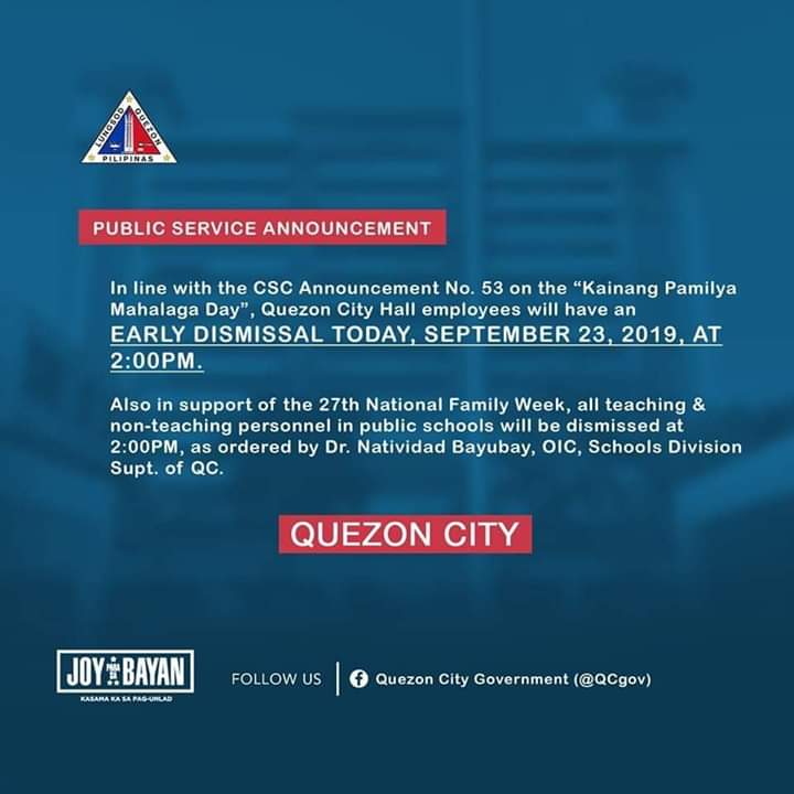 (Eagle News)–Work in the Quezon City hall is suspended today, Sept. 23, starting 2 p.m.