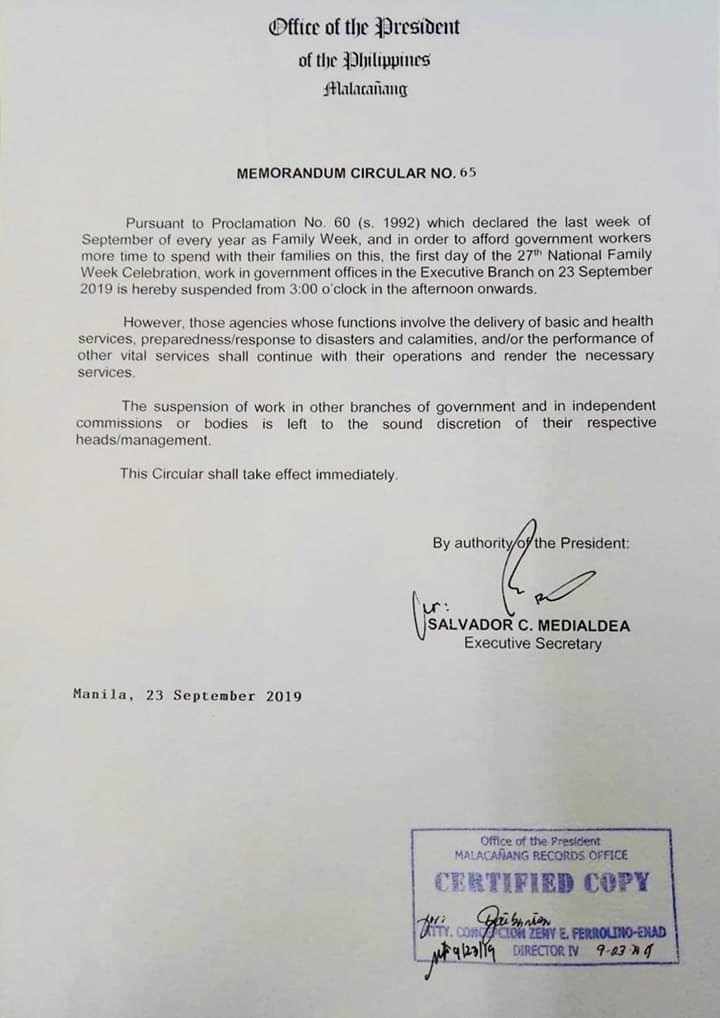 Memorandum No. 65 signed by Executive Secretary Salvador Medialdea said the suspension was to “afford government workers more time to spend with their families” pursuant to Proclamation No. 60 (s. 1992) that declared the last week of September of every year as Family Week.