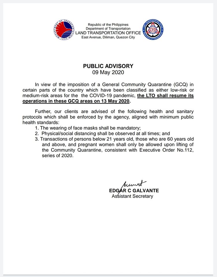 The LTO said this was consistent with Executive Order No. 112, Series of 2020.