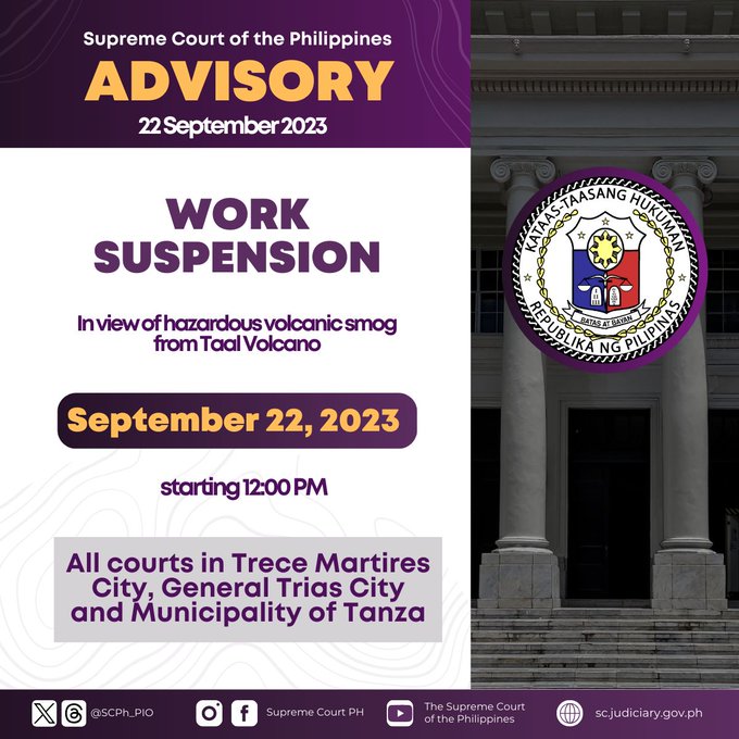 In response to the hazardous volcanic smog emanating from Taal Volcano, the Philippine Supreme Court Public Information Office announces the suspension of work for all courts in Trece Martires City, General Trias City, and the Municipality of Tanza.